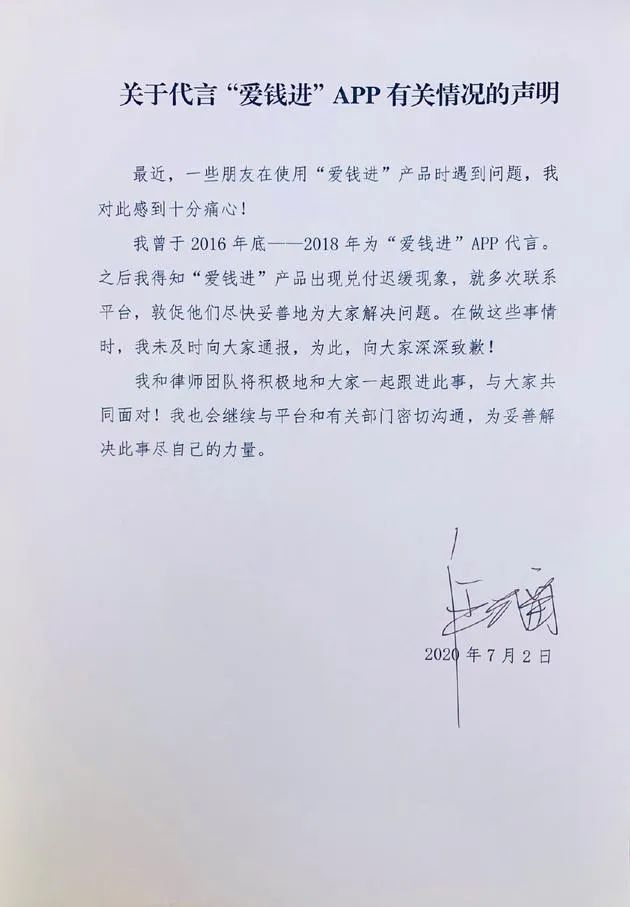汪涵道歉! 央视网 内地男星 2020-07-02 18:08:01 140 创作不易,用心坚持,欢迎请BaGua喝几杯爱心咖啡!打赏并支持本文 打赏并删除本文 近日,有网文称汪涵代言的“爱钱进”APP于2020年6月出现兑付困难,众多投资者在该产品上的资金无法正常提现,并表示希望曾是代言人的汪涵可以帮助投资者发声。今日(2日),汪涵独家回应称:对广大用户遭遇兑付困难感到痛心!2018年底代言已结束。汪涵本人及团队一直在联合相关部门、督促平台解决问题,希望能帮大家减少损失。随后,汪涵发布签名声明,表示自己和律师团队会积极跟进此事,与大家共同面对。一、汪涵曾于2016年-2018年期间代言“爱钱进”APP。二、因涉及到代言类产品合作,所以合作开始前,我们和法务团队密切沟通,严格履行了广告法和其他相关规定明确的代言人应尽义务,对平台资质的合法合规性、业务的真实性等进行了核实。如,对对方提供的平台资质资料做了核实;汪涵本人在代言前也在该平台注册为用户,体验了产品之后,才签署了合作协议。三、近日,“爱钱进”产品传出资金兑付困难消息后,汪涵先生对此十分关切,多次主动与该平台沟通,希望推动平台尽快解决问题,维护用户合法权益。汪涵先生就代言一事向有关监管部门进行过详细情况说明。同时,也在寻求更多方法提供帮助,包括委托律师团队积极跟进等。四、汪涵先生对大家遭遇资金兑付困难感到十分痛心!无论问题是否发生在其代言合约期间,汪涵先生始终以负责任的态度对待此事,也在尽最大努力,联合相关部门,督促平台方解决问题。同时,建议受到影响的朋友,通过消费者权益保护机构等正规渠道投诉。五、汪涵团队将继续与大家一起,继续密切关注、跟进此事,全力沟通、督促平台解决问题,最大程度维护大家的合法权益。被曝到期不偿还本息近日,P2P网贷平台爱钱进遭投资人“讨钱”一事登上热搜。记者查询发现,爱钱进App已暂停出借业务。大量投资人在社交网络上反馈,在该平台的出借金到期后收不到回款。有投资人质疑,爱钱进平台疑似已爆雷。不过,爱钱进官方信息发布渠道却屡屡否认,强调公司正常运转。记者查询发现,河南信阳浉河区人民法院今年6月披露了一项借贷纠纷民事裁定书,显示“因各地报案人数激增,公安机关已对爱钱进公司介入调查”。公司已暂停出借业务出借业务停摆、投资人无法提现、客服热线迟迟忙音……P2P借贷平台上的经营“异常”让投资人心生动摇,有人质疑称“爱钱进是否走上了P2P爆雷的老路”。近日,爱钱进遭投资人“讨钱”一事登上热搜。这家国内知名P2P平台的“异常”经营情况,也暴露在公众面前。记者查询发现,在社交网站和第三方投诉平台上,大量爱钱进投资人反馈“投资到期后无法提现”“申请债权转让后无法退款”等。针对以上问题,记者7月1日起多次拨打爱钱进官方客服热线,均未接通,热线电话自动留言称“坐席全忙”。7月2日,记者查询发现,爱钱进公司官网及官方App列出的多项投标产品中,“立即投资”按钮已变灰色,投资人无法进行出借操作。同时,两处平台也无法进行新用户注册。在铺天盖地的质疑声中,爱钱进官方信息发布渠道却屡屡否认,强调公司正常运转。7月1日下午,爱钱进官方微博在回复网友质疑评论时反复表示,“您好,目前公司仍在正常运营当中。相关资讯,一切以官方发布为准。”在第三方投诉平台“黑猫投诉”上,2日9时54分,爱钱进官方账号在投诉帖下回复:公司努力促进大家的债转交易,但是否能够转让成功,取决于市场环境以及其他用户的债权受让意向。“当前市场活跃度较低,等待转让时长较长,请您耐心等待。”有裁定书显示“公安机关介入”面对迟迟无法收回的出借款,有投资人通过诉讼方式,要求爱钱进平台偿还出借资金和利息。记者注意到,河南省信阳市浉河区人民法院于今年6月披露了一项借贷纠纷民事裁定书。其中显示,“因各地报案人数激增,公安机关已对爱钱进公司介入调查”。上述裁定书显示,原告石某宇诉称,其分别于2019年9月18日、2019年10月1日、2019年10月28日向被告爱钱进(北京)信息科技有限公司出借50000元、10000元、10000元资金,约定借款期限分别为6个月、6个月、7个月,出借资金到期后,被告偿还部分本金后拒不偿还剩余出借资金和利息。石某宇诉请法院,判令被告支付原告61694元(利息按年利率9%从2019年10月1日起至判决生效之日止)。同时,因该案产生的诉讼费,财产保全费,担保费一切费用均由被告承担。该项判决书显示,法院经审查认为,原告石某宇于2020年5月28日向管辖地公安部门刑事报案,公安机关接受了报案材料并做备案登记,后因各地报案人数激增,公安机关已介入调查。被告爱钱进(北京)信息科技有限公司已涉嫌刑事犯罪。该案的诉讼不属于人民法院受理民事诉讼的范围。最后,法院裁判结果为“驳回原告石某宇的起诉”。▼更多新闻,扫描二维码关注央视网©央视网编辑:单镜宇责任编辑:孟夏来源:南方都市报丧心病狂!乱港暴徒刺伤警员为香港转起漂亮!“有冇搞错,关你咩事?” 创作不易,用心坚持,欢迎请BaGua喝几杯爱心咖啡!打赏并支持本文 打赏并删除本文 感谢您的支持鼓励,我会继续努力的!文章地址:用户邮箱:打赏金额:USDT 请输入数字点击”去打赏“,即可进行打赏支持本文章哦 汪涵 发表评论