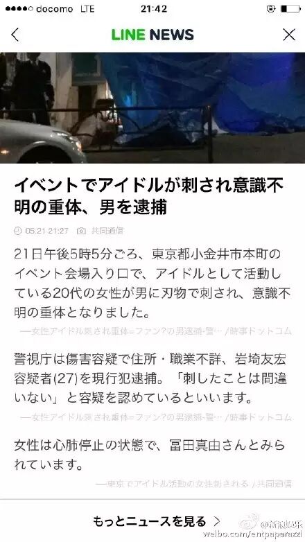 昨天20岁的日本女偶像富田真由表演前被一男粉丝连续砍了20多刀,当场失去意识。