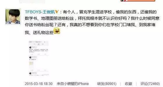 2015年3月,有网友在网上兜售王俊凯的课本,并且称都是经过王俊凯本人同意的,随后王俊凯转发此微博,并辟谣称:“有个人,冒充学生混进学校,偷我的东西,还偷我的数学书、地理图册送给粉丝,拜托我根本就不认识你好吗?我什么时候同意你送书给粉丝呢?还有,我真的不想看到你们在学校门口堵我、到我家堵我、送礼物这些。”