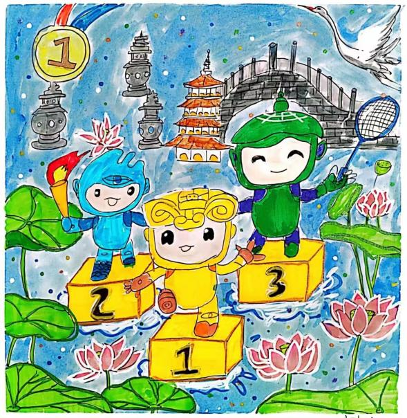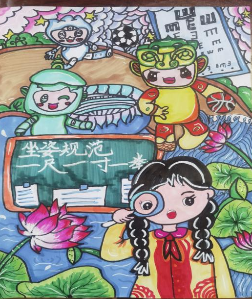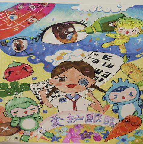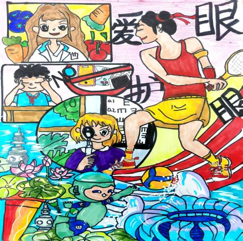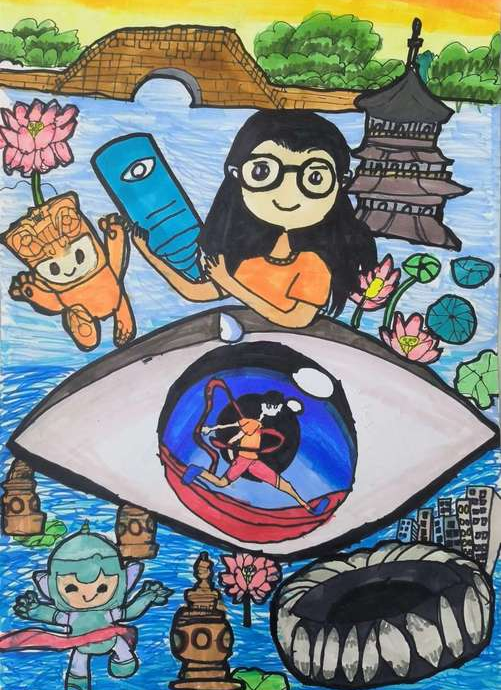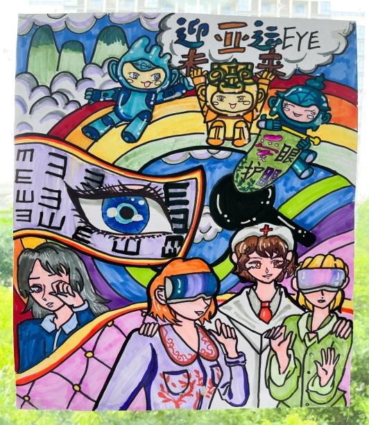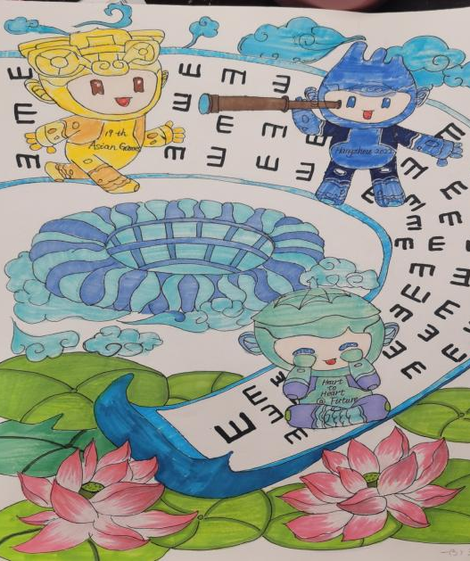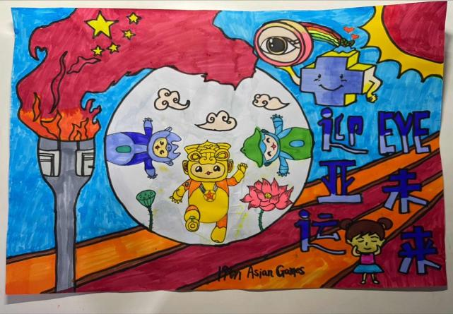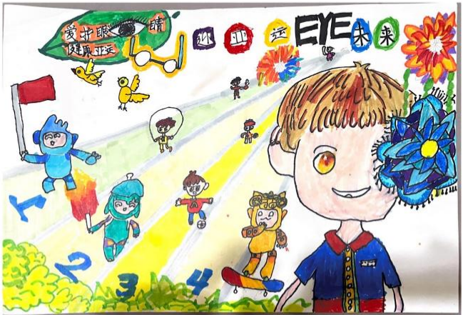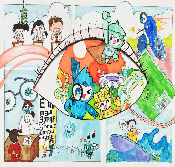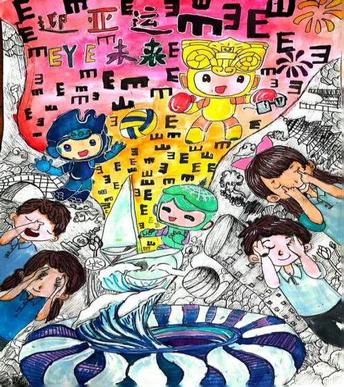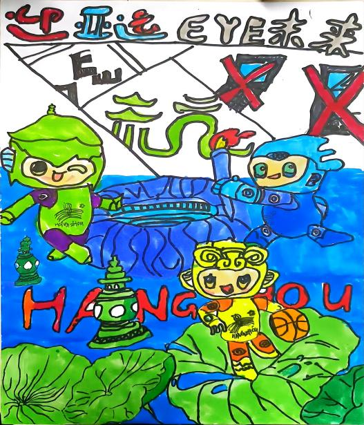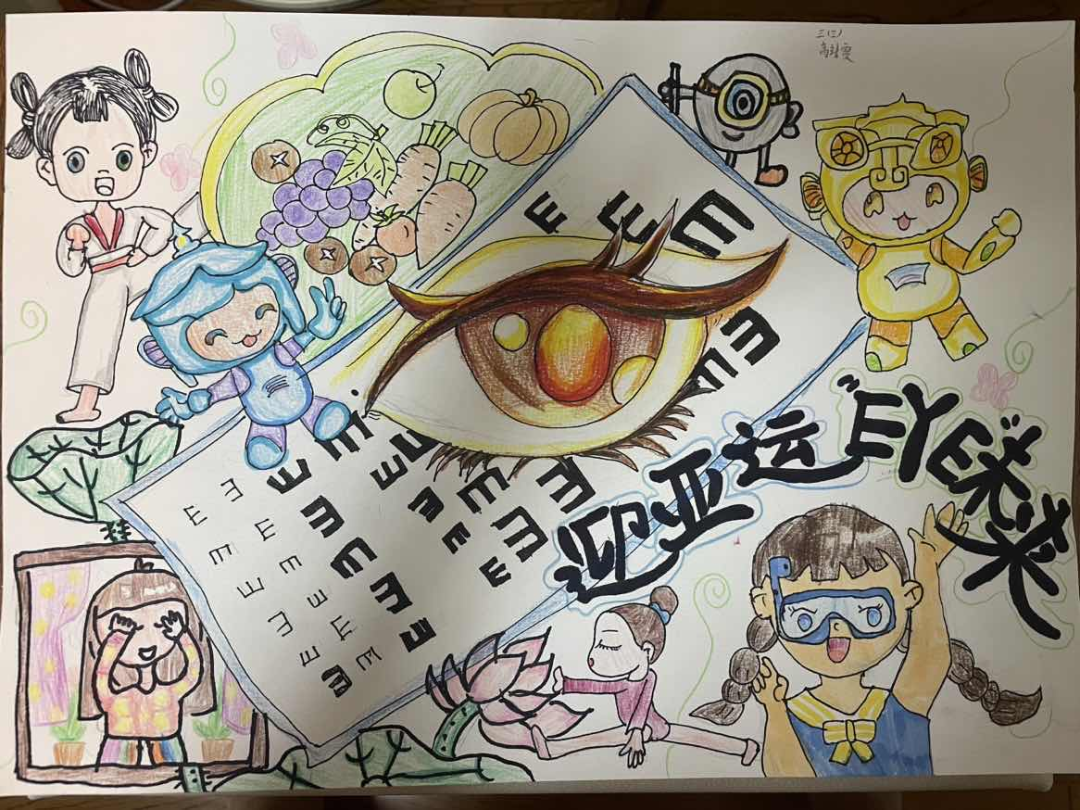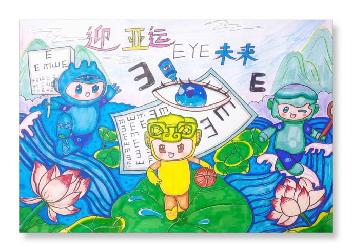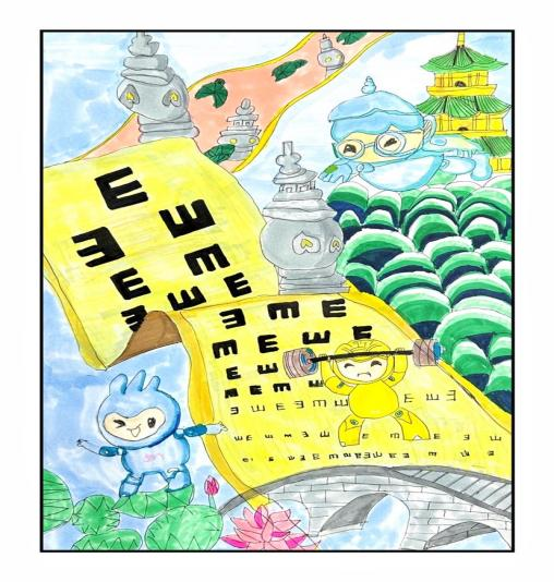 眼睛是心灵的窗户,过度用眼容易使眼睛疲劳,增加近视率。在杭州亚运会到来之际,我们提倡加强户外运动,减少近距离用眼时间,增加与大自然接触的活动,积极参与体育锻炼,以更好的面貌迎接杭州亚运会。让我们一起来看看少先队员们是如何用绘画的形式来宣传“迎亚运·EYE未来”主题活动的吧。