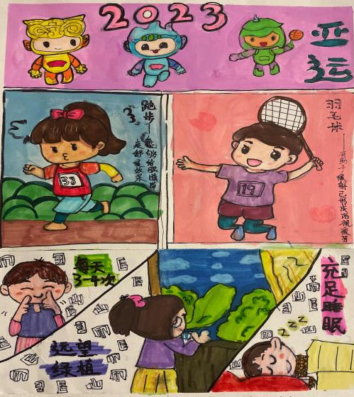 二三年级的少先队员们通过绘画的形式向大家宣传爱眼护眼迎亚运以及营造和谐友爱的亲子沟通氛围。让我们一起树立健康的护眼观念,保持充足的睡眠、坚持膳食均衡、加强户外体育锻炼,科学做眼保健操,用更明亮的双眼看世界,用更健康的体魄迎接亚运的到来。同时,也让我们积极与父母进行有效沟通,学会民主平等、学会理解包容、学会尊重有爱,一起努力营造和谐有爱的家庭氛围。