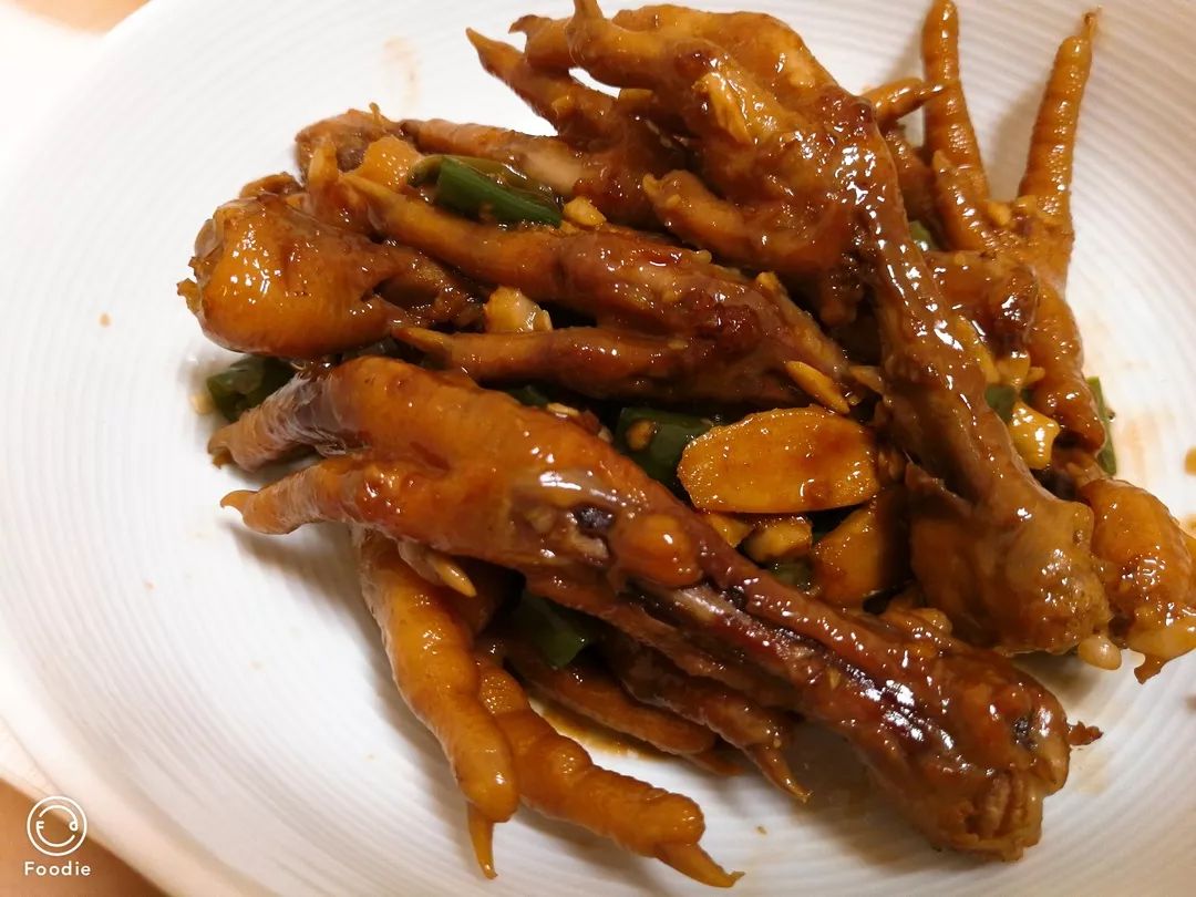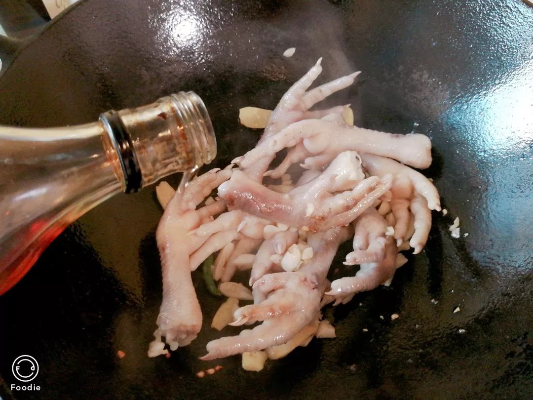 3、再倒多一些油,放入蒜末、姜片爆香,倒入焯好的鸡脚,翻炒。