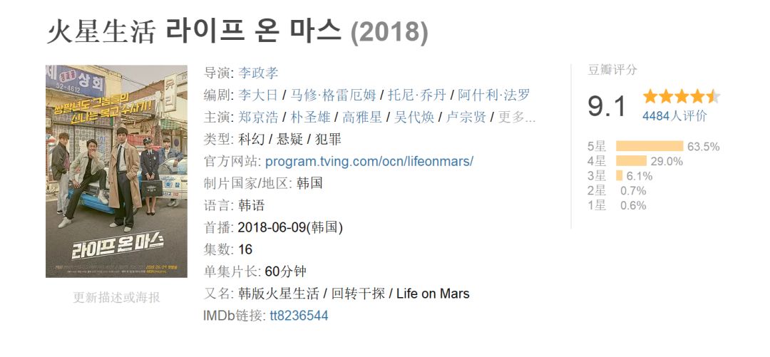 豆瓣:韩版《火星生活》由OCN翻拍自同名英剧,讲述了因突发事故而穿越回到过去的刑警为了回归自己原先的生活而解决连环杀人案的故事。