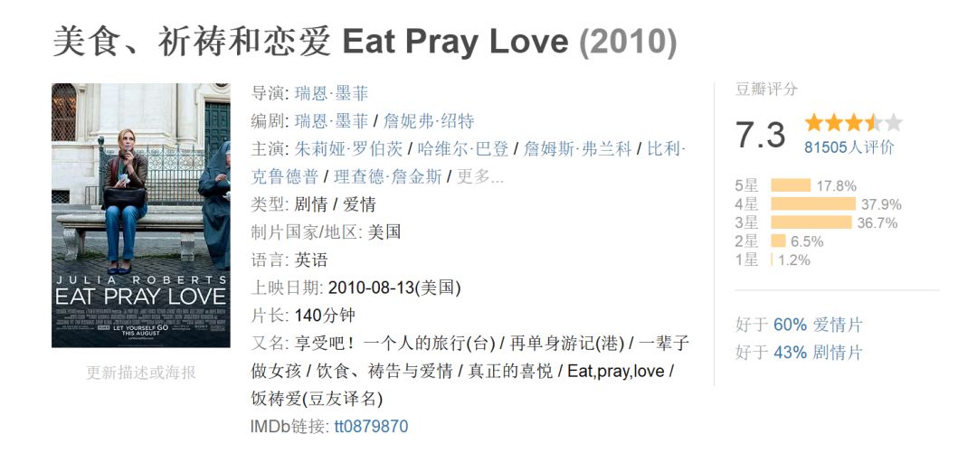 豆瓣:年轻干练的伊丽莎白·吉尔伯特(朱莉娅·罗伯茨 Julia Roberts 饰)是《纽约时报》的一名人气作家,她经常周游世界,撰写相关的旅游文章。她的生活同样令人欣羡,丈夫史蒂芬(比利·克鲁德普 Billy Crudup 饰)帅气潇洒、气质不凡;饮食无忧、优哉安 乐。然而伊丽莎白却渐渐感到空虚和恐慌,似乎着周遭的一切都不是她真正追求的。伊丽莎白决定走出变质的婚姻,寻找自我。在漫长的离婚拉锯战后,她踏上了周游世界的旅途,在美食、祈祷和恋爱中,认真地思考人生的种种……