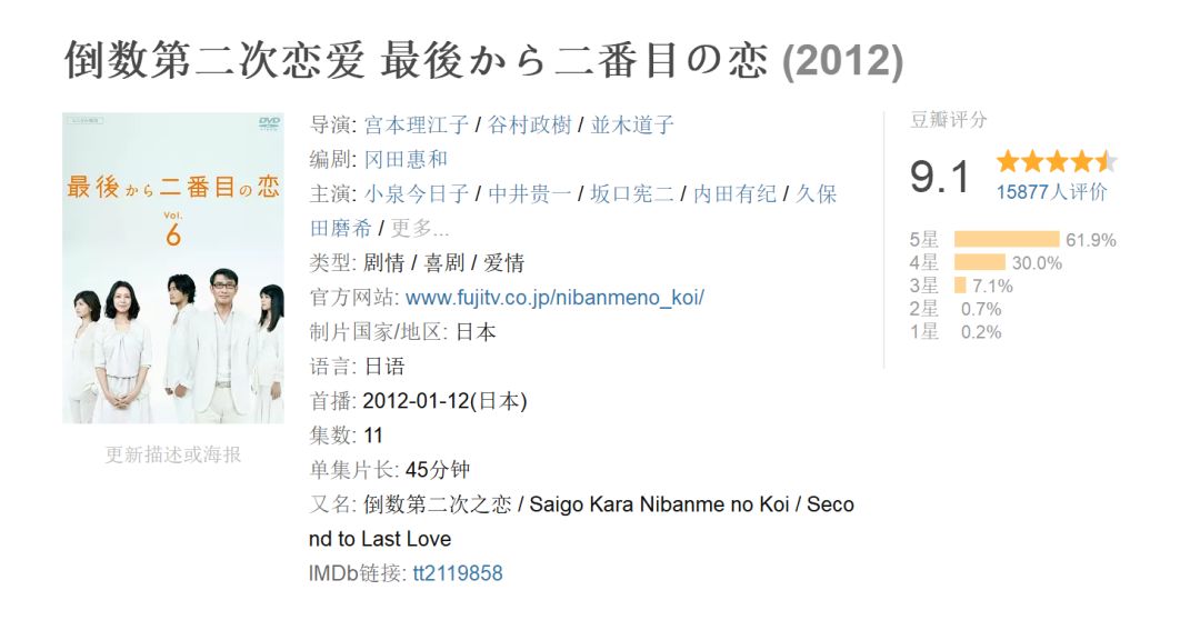 豆瓣:人生到了四五十岁,似乎就不再期待恋爱了?吉野千明(小泉今日子 饰),45岁,单身,职业是电视剧的制片人。有不错的收入,有亲近的朋友,却对恋爱不再抱有希望。觉得自己将要孤老下去的千明考虑到养老,花费自己的全部积蓄,在古都镰仓买下了一座旧宅。在考察镰仓的时候,遇上了当地观光推进科的工作人员,50岁的长仓和平(中井贵一 饰)。二人如同汤姆和杰瑞,结下了孽缘。碰巧,千明的邻居就是长仓一家,由和平的弟弟真平(坂口宪二 饰)经营着咖啡店。治愈系的真平,让千明重新燃起恋爱之心,和长仓家也越走越近。除了真平和长平,还有啰嗦的小妹典子(饭岛直子 饰)和怕见生人的万里子(内田有纪 饰),趣事不断上演。 45岁,人生行将过半,成了别人口中的“欧巴桑”。恋爱一词让人胆怯难为情却仍旧货真价实的美好。下一次恋爱,把它当成倒数第二次恋爱,就算是“欧巴桑”的未来,仍旧有期待。