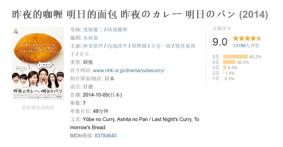 撸大包:不知道大家看过《小森林》、《海鸥食堂》这类电影没有?如果你喜欢那种日式、清新、安静日常的治愈系电影,那《海女》以及下面分享的《昨夜的咖喱,明日的面包》、《倒数第二次恋爱》会很适合你,这几部是我从一个豆瓣帖子的评论里收集来的,年份还算新。