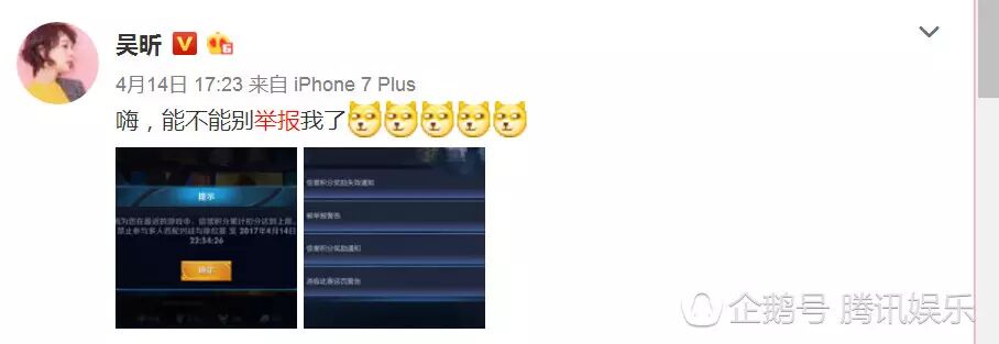 吴昕:我经常被举报。举报多次就是被禁赛,我有一段经常被禁赛,我真的很崩溃。我就发微博,能不能别举报我了。为什么玩一个游戏,大家都要举报啊。