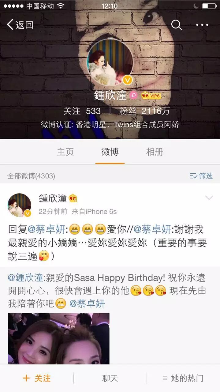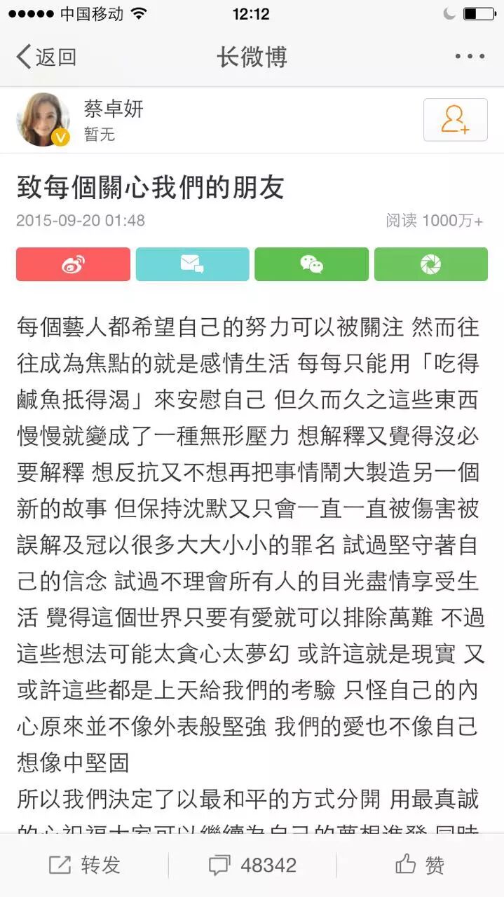 巧合的是蔡卓妍和陈伟霆的生日仅相差一天,前后脚过生日的他们,连分手也是一前一后。二人题目不同内容完全相同的声明,“只怪自己的内心原来并不像外表般坚强,我们的爱也不想自己想象中坚固。”