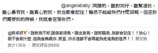 众所周知,Angelababy在荣升黄教主夫人之前,曾经和陈伟霆谈过恋爱,而在早期蔡卓妍宣布和陈伟霆恋爱的不久,Angelababy就曾回复网友提问来借机暗讽两人的恋情时间,疑似劈腿传言: