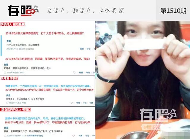 ▲图左林允微博爆粗口内容截图,图右林允早年在微博晒照