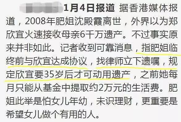 不过在遗产之外,郑欣宜还有一处物业,是2009年用980万购买的,所以说,郑欣宜可确实是一位富婆了。而在沈殿霞去世前曾和郑欣宜约定其35岁后才能动用遗产,这之前一个月只能从基金中取两万块生活费,就是为了女儿能够自食其力,不要贪图享乐。