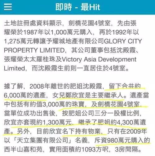 有意思的是沈殿霞从2008年去世后,留下大约6000万港币的遗产。而女儿郑欣宜是其法定的继承人,这些遗产包括价值三千万左右的珠宝首饰,还有就是这栋“剑桥花园4号室”了,价值1.3亿。
