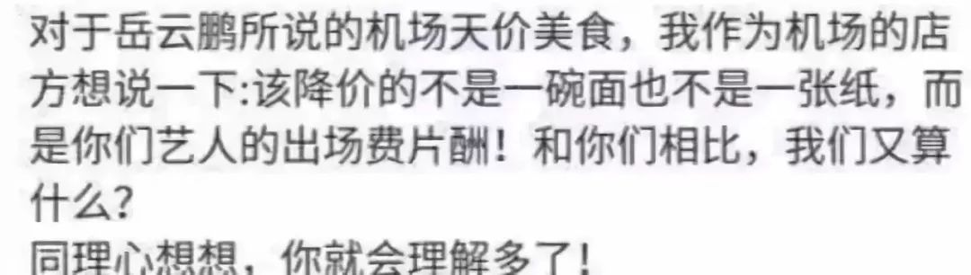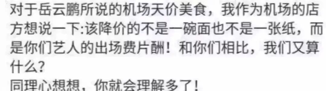 有人说,岳云鹏以一个公众人物的身段,去攻击一个普通商家的老板,这是以大欺小。况且即便他吐槽了,也没啥用,你看刘晓庆、黄晓明等人不都吐槽了吗?机场周围的高价饭不也依然存在吗?