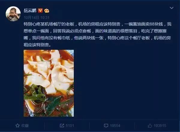 10月14日,著名相声演员岳云鹏在微博发文调侃,“在某机场吃面,一碗酱油面卖88块,想单点一碗面,回答说必须点套餐,面的味道真的很想落泪,吃完想擦擦嘴,问餐厅老板要,说两块钱一张。特别心疼这个餐厅老板,机场的房租应该特别贵。”文字下面还配了一张面的图片。