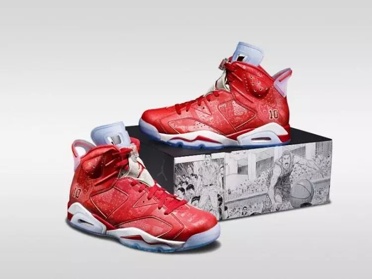 而井上与乔丹最终都没有让他们的爱好者所失望,在2014年发售了这一双全红配色 Air Jordan 6 Retro " Slam Dunk " ,鞋身与鞋盒侧面部分都有樱木花道在漫画中的经典画面,鞋侧底部则是樱木花道的 "10" 号球衣号码。与此同时一并发售的还有一双 Jordan Super.Fly 3 " Slam Dunk " 以及本次Jordan x Slam Dunk 系列的T恤和帽子。在此次合作系列发售之前,Jordan Brand 为表诚意还曾经发布过 Jordan x Slam Dunk 的产品预告片。
