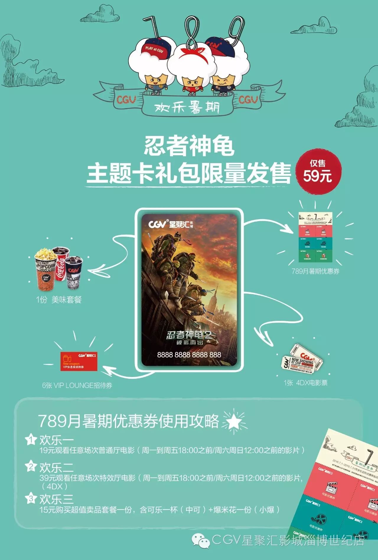 1张忍者神龟主题卡+1张4DX电影票+1份双人套餐+6张VIP LOUNGE招待券+7月/8月/9月暑期优惠券各1张