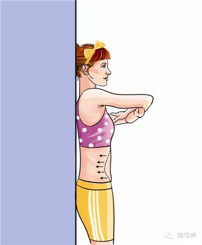 注意事项:避免手臂向后推墙,尽可能腹部向内收,主动靠近墙壁,想象用肚脐向墙壁方向靠近的感觉。