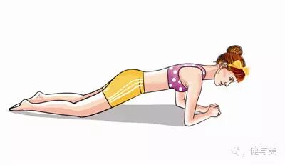 准备动作:俯卧,肘关节与肩关节垂直。膝关节撑地,保持上身平行于地面。