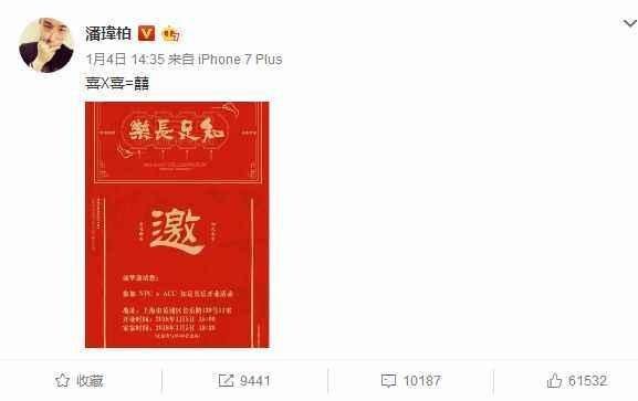 在1月4日的时候,吴昕在自己的微博上晒出了一组美美的婚纱照。这是一组写真集,和结婚并没有什么关系。也正是这样,体现了潘玮柏和吴昕之间的默契性。或许说是刻意为止,就在吴昕晒出照片的两个小时之后,潘玮柏也更新了自己的微博,更重要的是他晒出的是一张红色喜帖。