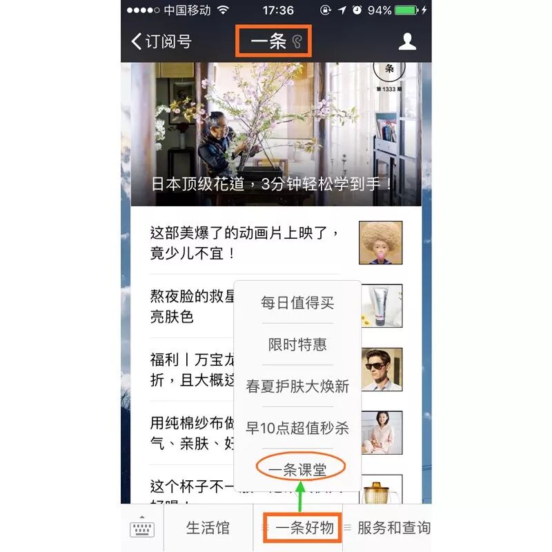 入口一:进入微信,搜索并关注“一条课堂”,底部菜单即有课程入口。