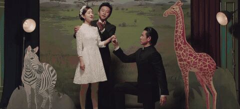 故事发生在一个照相馆里,彭于晏穿着黑色中山套装,赵丽颖一身白色蕾丝连衣裙,两人并排端坐在椅子上,认真又甜蜜,站在身后的邓超则西装革履,笑容满面。三个人在“非洲大草原”背景板前,面对镜头,留下了一张珍贵的合影。