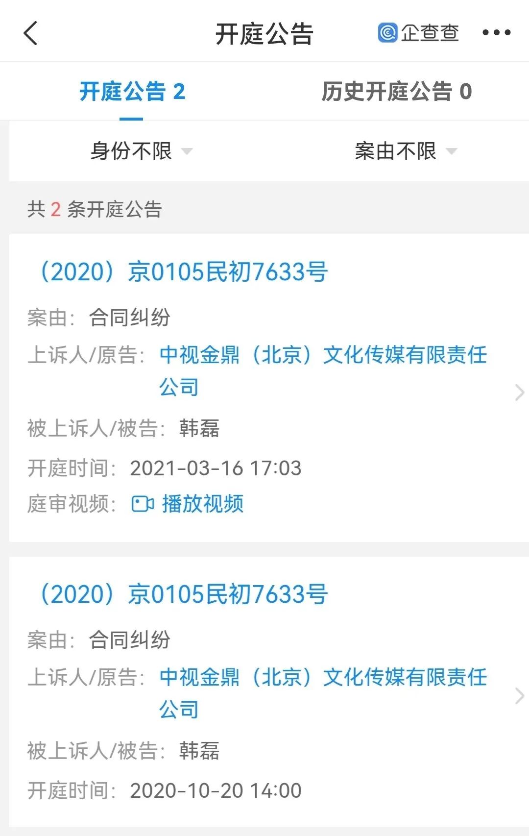 天眼查APP显示,中视金鼎与韩磊的合同纠纷,分别在2020年10月20日和2021年3月16日开庭,审理法院均为北京市朝阳区人民法院。