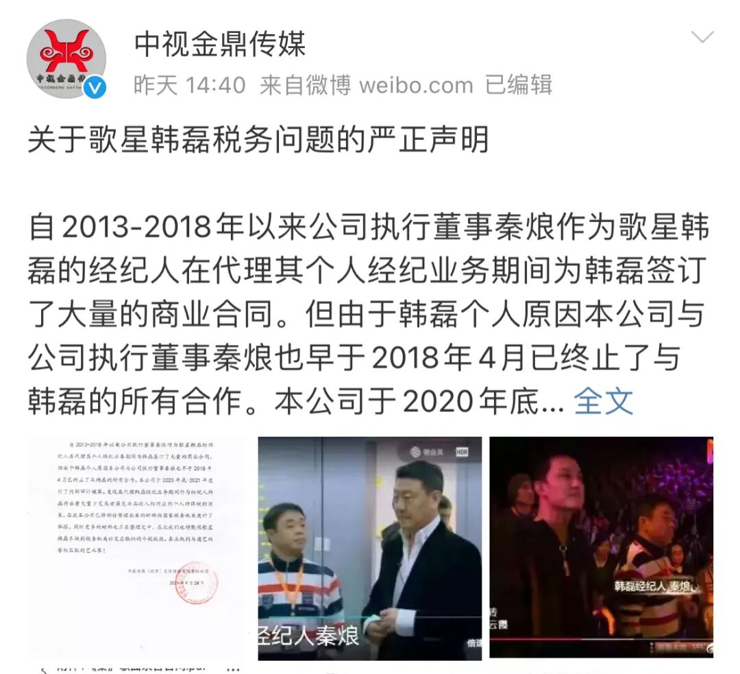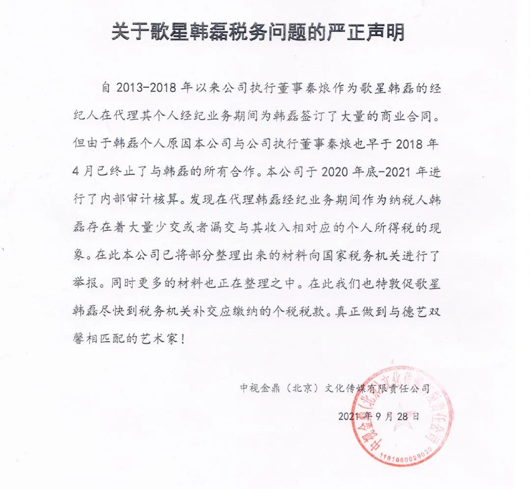 9月28日,微博认证为“中视金鼎(北京)传媒有限责任公司”的官微“中视金鼎传媒”发布了一条《关于歌星韩磊税务问题的严正声明》。
