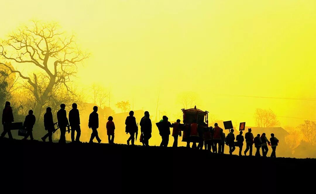 眼看娶亲队伍马上就要到新郎官家了,我相机的电池也消耗殆尽了,便安静地走出了娶亲队伍,思考着如何找机会进行最后一搏了。当晨光染满了半边天空,零星的房屋在雾里若隐若现,娶亲队伍从村口穿过……