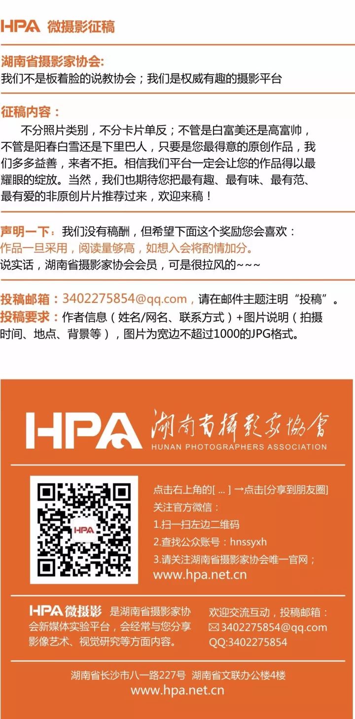 您可以关注湖南摄协官方微信,在HPA服务中选择“HPA赛事”,在手机端投稿参赛;如果嫌手机投稿不过瘾,您也可以登录www.hpa.net.cn,选择在HPA湖南摄影网各影赛专区投稿参赛。