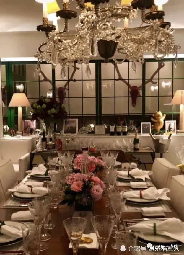 在房间的餐桌上,台灯与餐桌的设计也非常具有仪式感,同时,也尽显出了高贵的奢华与优雅,而在餐桌上也还放着许多的酒杯与名酒,看来是刘嘉玲为了款待宴客而准备的,想必,当晚是要与宴客们来场不醉不归的宴席呀!