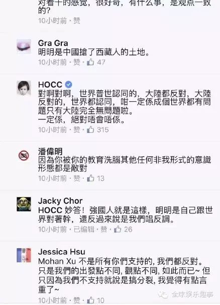 一个娱乐博主写道这么一段:“中国的败类何韵诗,不,你不是中国人,真的是什么事都要掺一脚…简直是LES界的耻辱,你不认同一个中国,你觉得你搞台独你就是牛X的人了?错,你是败类中的败类!垃圾中的垃圾!同意的顶起来!”
