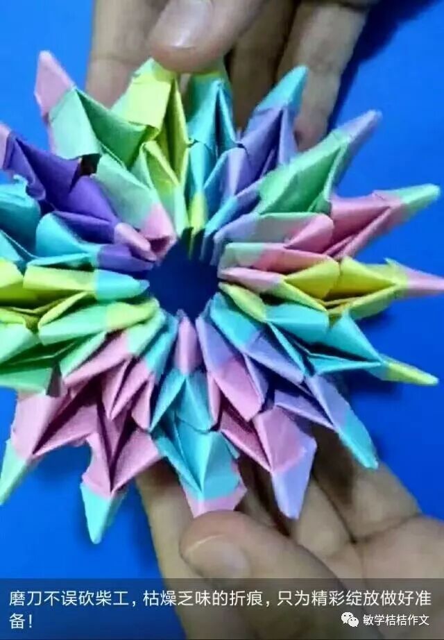 它的精彩绽放分明在告诉我,人生不也如这个烟花一样吗?这单调乏味的折痕,就如人生中必不可少的求学生涯,单调而苦闷,但只有经受了单调的埋头苦读,不浮躁,才能登上自己的人生舞台长袖善舞,绽放精彩的自己。