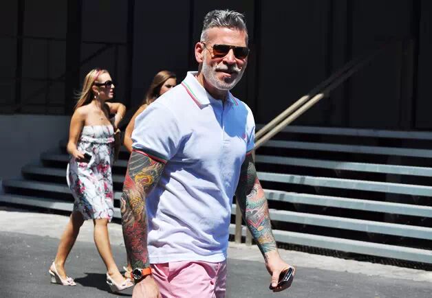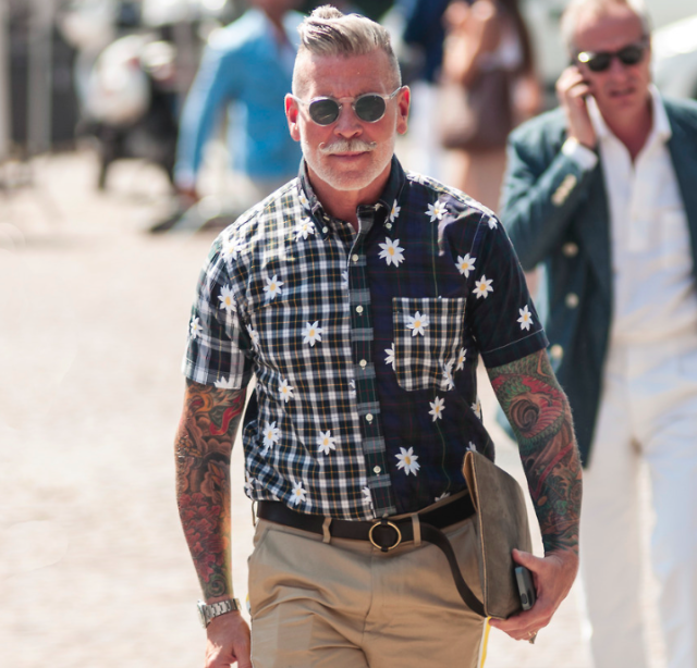 身为全球最会穿衣的男人,NickWooster 除了穿衣搭配值得关注之外,在夏季两只花臂更充当着搭配的主角,毕竟要露出手臂。Nick 大叔的纹身充满了日本风格,红绿的配色有点像日本黑帮的效果。