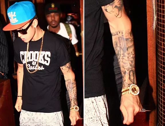 Justin Bieber 的花臂其实也受到 Chris Brown 的影响,他们一度曾经玩得非常亲密,就算连穿着打扮的风格也一样。而丁日的花臂的图案大多数还是以卡通为主,当中包含了录音机,小丑,8号球等。