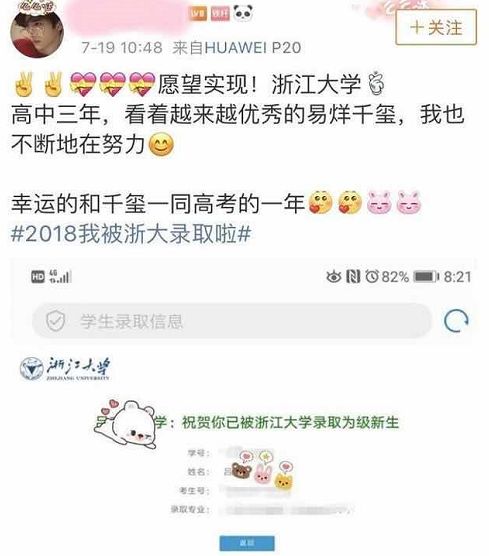 “愿望实现!浙江大学,高中三年,看着越来越优秀的易烊千玺,我也不断地在努力,幸运的和千玺一同高考的一年”。这位同学也是相当优秀了下面还有更霸气的!