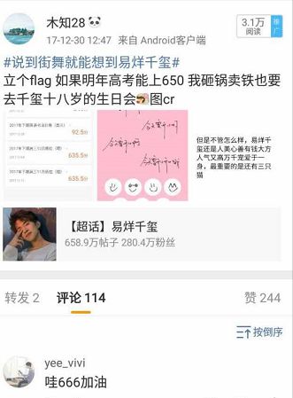 这位同学去年曾发过这样一条微博:立个flag,如果明年高考能上650,我一定会去千玺的十八岁生日会。今年就真的实现了,妥妥的659,这确实是真爱粉呀~这位姑娘连姓都跟千玺是同一个,怪不得这么优秀!↓↓