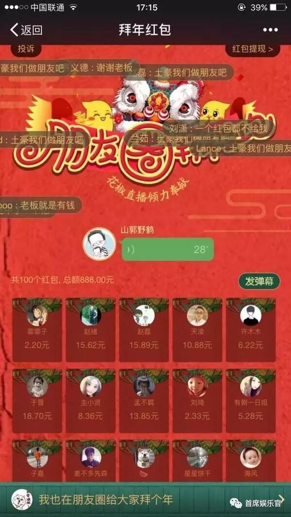 除夕夜,花椒直播CEO周鸿祎也在直播间分发1000万红包;张继科、马龙、王祖蓝、潘玮柏、林宥嘉等近百位明星也在春节期间直播拜年并发出累计金额1000万的红包。“国民老公”张继科在除夕晚上的直播吸引了400多万粉丝观看,超高的人气使得张继科的花椒红包创下多个记录:单一红包200万人疯抢,同一秒抢红包人数高达38万。