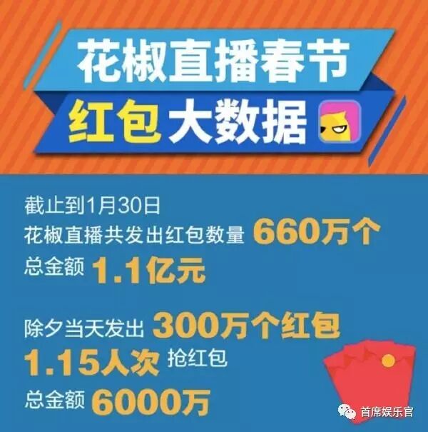 花椒直播是直播行业首家加入春节红包大战的平台。也是最“壕”的一家。今年首次加入红包大战的花椒直播,1月31日发布春节期间红包战绩,大数据结果统计:截止30日,花椒直播平台上共发出660万个红包,总金额1.1亿元,仅除夕当天就发出300万个红包。