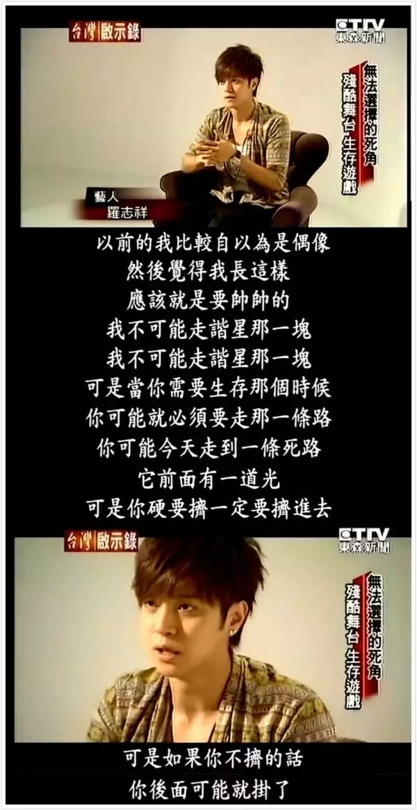 当时罗志祥说:“以前的我自以为是偶像,长的也比较帅,我不应该走谐星这条路的,可是当你需要生存的时候,你可能就必须要走那条路,你可能今天走到一条死路,它前面有一道光,你要不挤进去的话,你后边可能就挂了。”