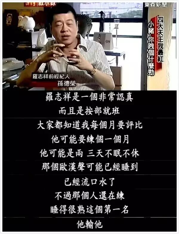 “罗志祥是一个非常认真,而且按部就班,大家都知道我每个月要评比,而罗志祥可能要练上一个月,他可能是两三天不眠不休,那个欧汉生可能已经睡到流口水了,不过那个人还在练。”