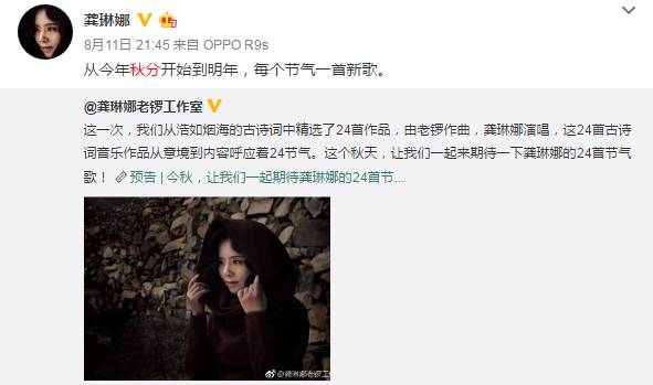 在写这篇文字的时候,龚琳娜的微信公众号发来了她最新的作品:24节气歌《霜降·碧云天》。24节气歌是龚琳娜和老锣的最新系列作品,她们选取相应的古诗词配上曲子,在音乐中演绎每一个节气。
