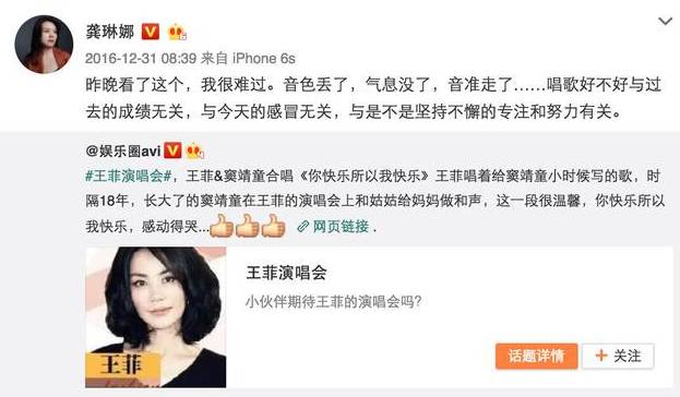 这是她的原则,她的坚持,她的死理。从这个角度出发,我们或者可以理解她年初批评王菲一事。