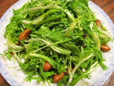 一般也是凉拌了来吃,用香醋、酱油和一点糖,拌入切细的大葱丝和香菜,蒜末酌情放点儿。我叫它“老虎菜”。外面吃自助餐,似乎味达美拌苦菊比较常见。
