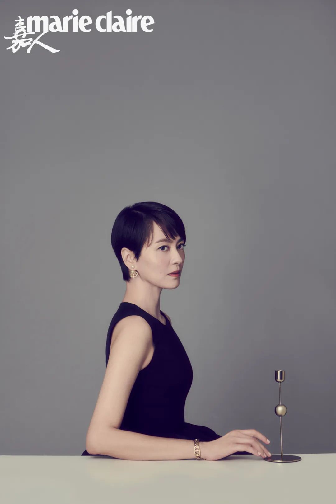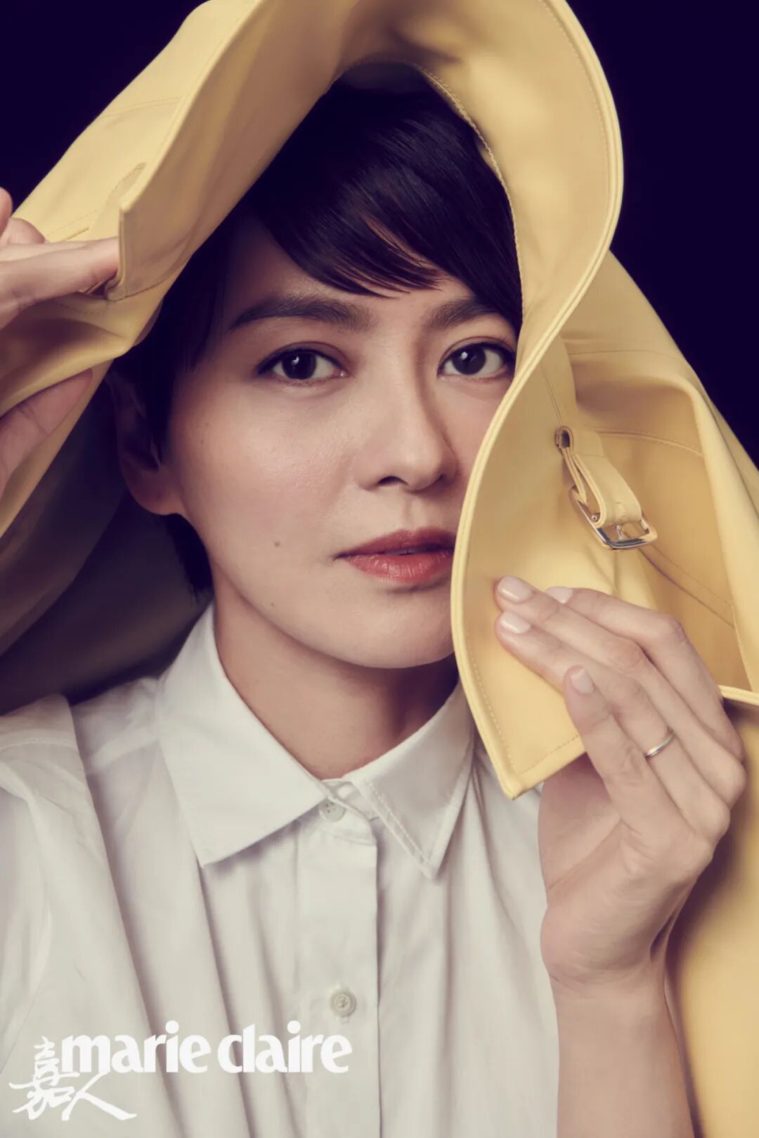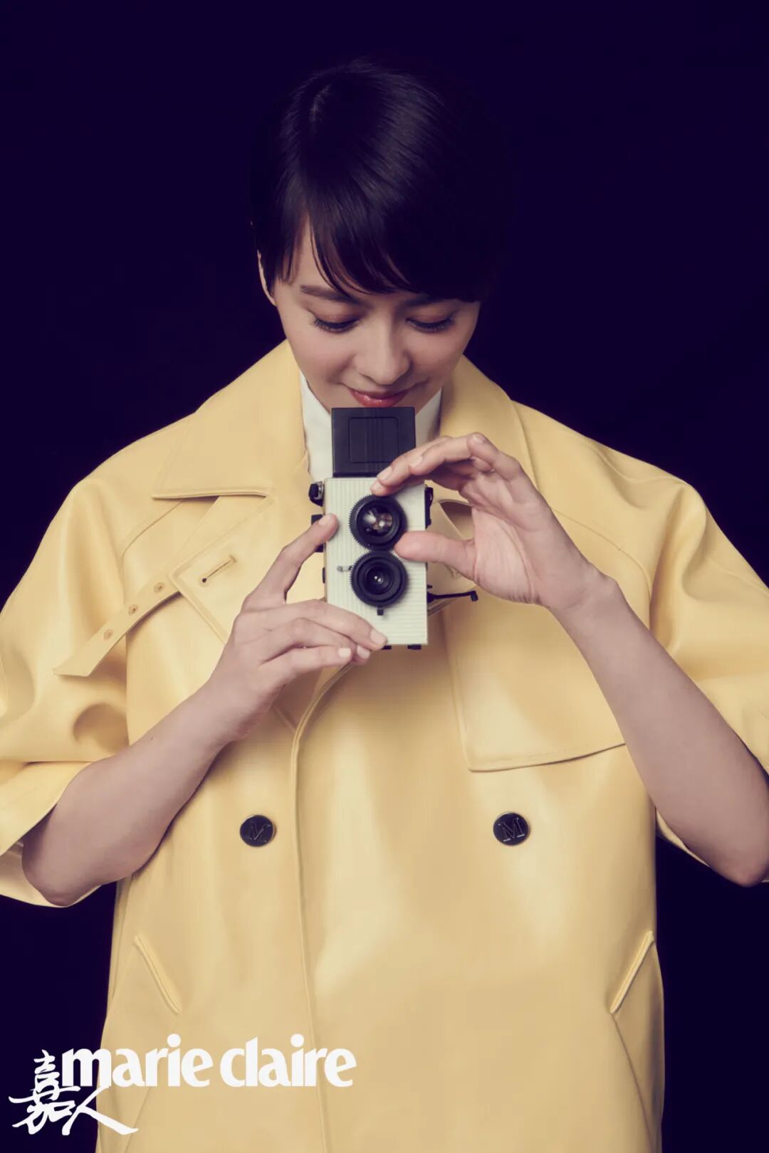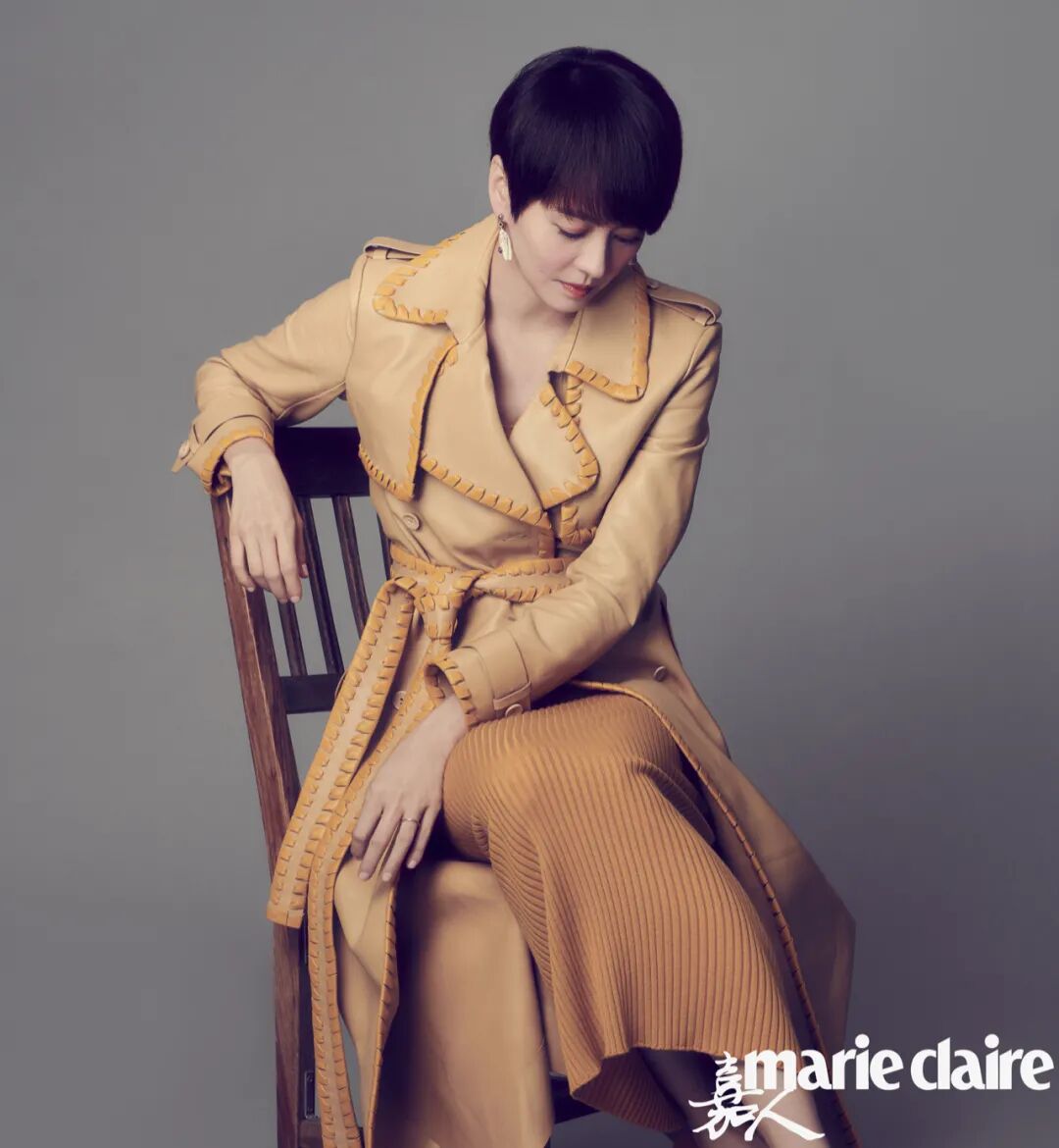 土黄色针织抹胸上衣、土黄色针织半截裙、卡其色皮革长外套连腰带、贝壳耳环 均为CHLOÉ