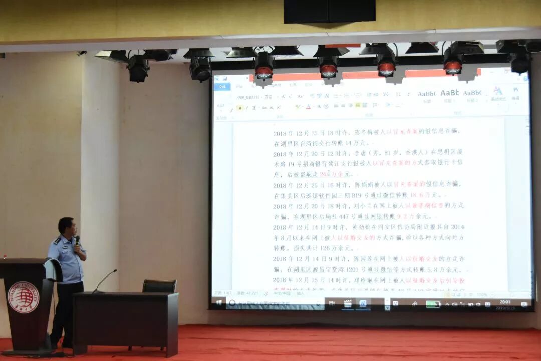 紧接着,朱仕灶队长上台传授同学们安全及防骗知识。朱队长从虚假信息诈骗、盗窃、打架斗殴、校园贷、毒品等方面,结合相关案例,详细讲述了当下校园的安全问题,并针对其中的重点高发安全事件,提出了相应的防范措施。