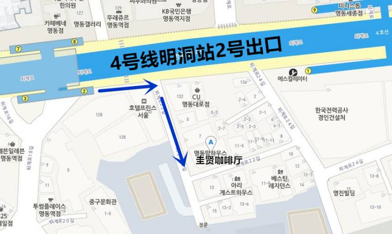 圭贤“MOM HOUSE”位于明洞地铁1号出口和2号出口之间,交通方便非常好找.