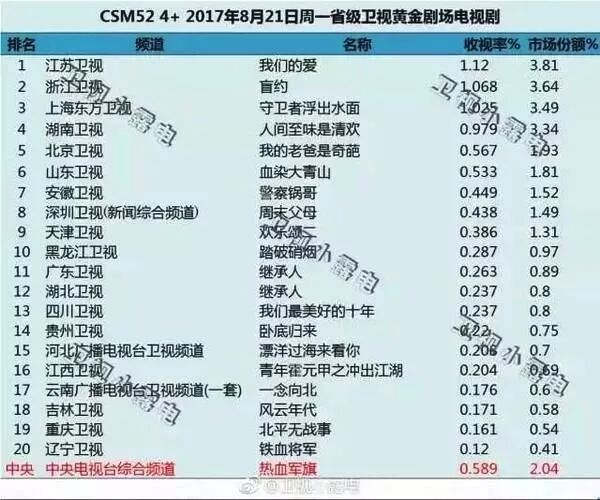然而收视率证明,江苏卫视抢跑的战略是有效的,同样是靳东主演的积压剧,《守卫者浮出水面》收视率一直在《我们的爱》之下。但是,相比同期其他电视剧,《我们的爱》和《守卫战》虽然是积压剧,依然都取得了不错的成绩。