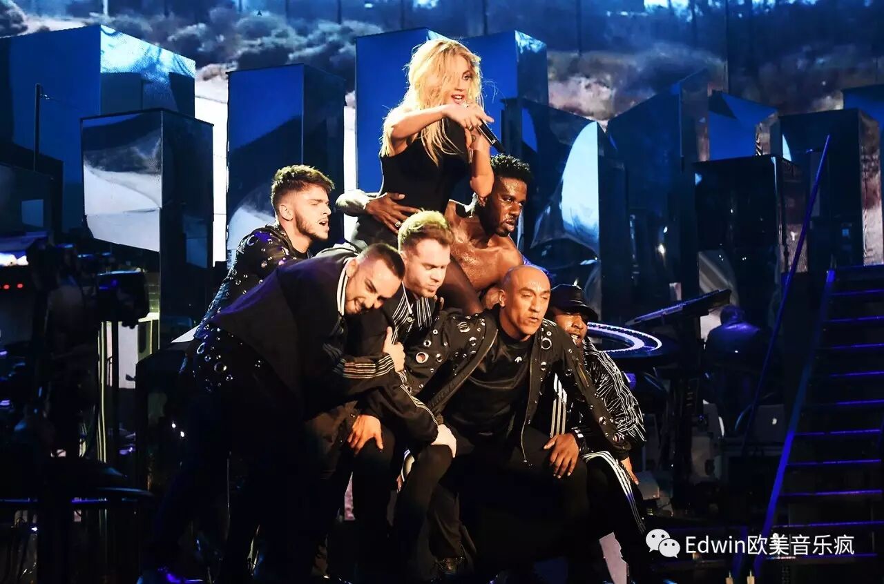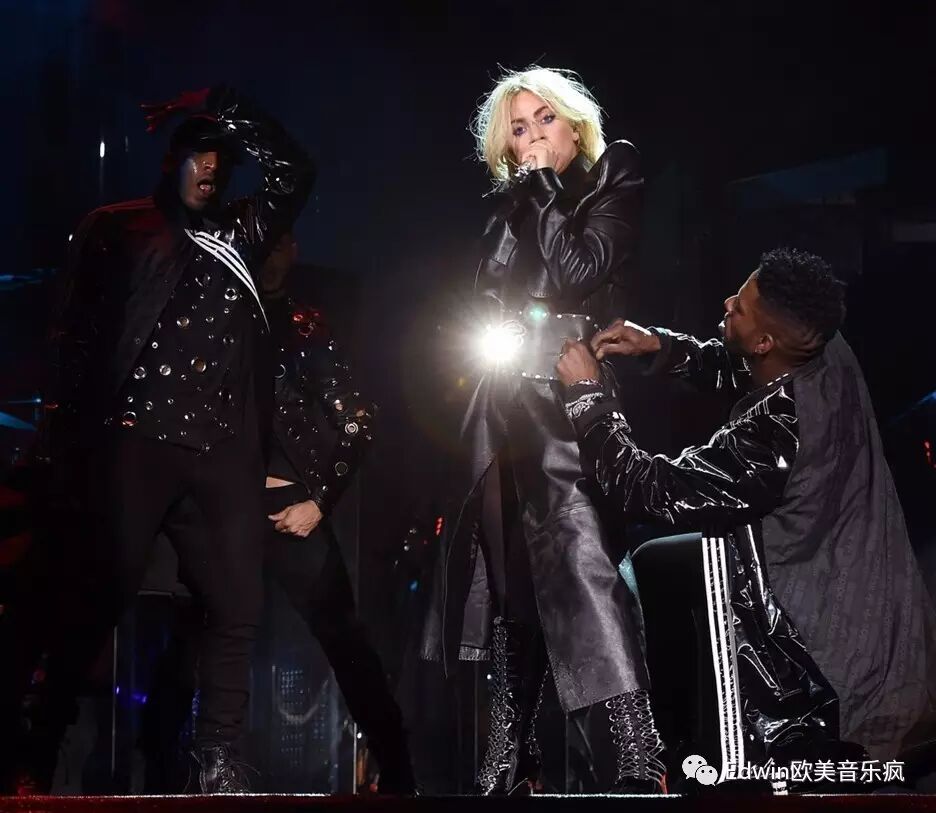 Lady Gaga身穿Mugler 2017秋冬系列黑色皮衣演出,腰上的腰封还会发光,十分抢眼。