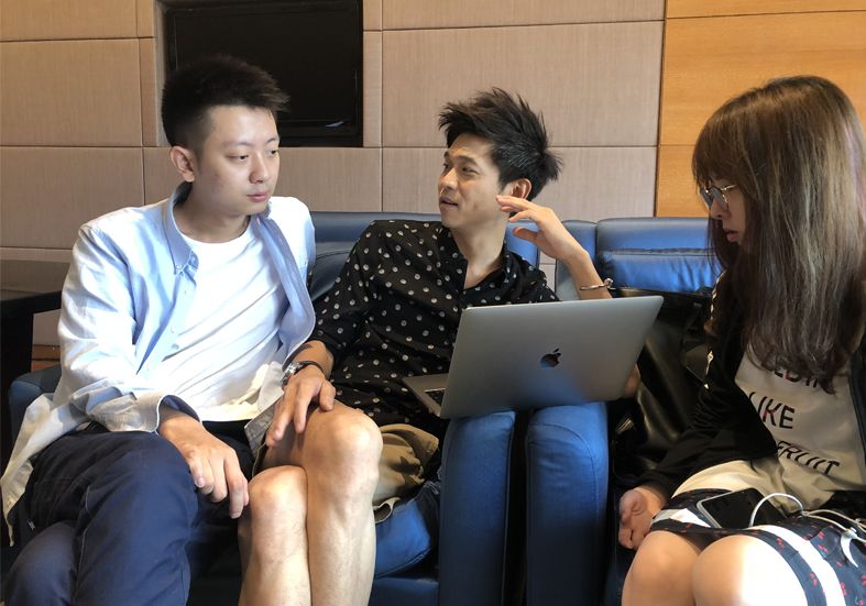 在一旁的休息室,邱茂庭坐在沙发上,左边是他的助手,帮他拿着电脑;右边是品牌总监谭力,当他的观众:三个人坐在沙发上,开始过PPT。
