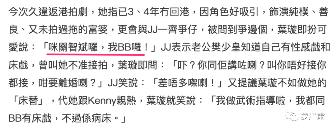 她无惧网民评价,若有人觉得她丑,即代表她成功:「譬如我扮奸角,别人都骂我,就是我成功咯?扮丑,别人说我又肥又丑,不就是我成功咯,不丑卖货就卖不出去。角色是这样就要这样,难道你演床戏,别人会真觉得你就是戏里那样姣?」